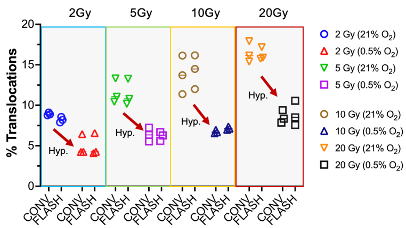 #24: Barghouth PB, Melemenidis S, Montay-Gruel P, Ollivier J, Viswanathan V, Jorge PG, Soto LA, Lau BC, Sadeghi C, Edlabadkar A, Zhang R, Ru N, Baulch JE, Manjappa R, Wang J, Le Bouteiller M, Surucu M, Yu A, Bush K, Skinner L, Maxim PG, Loo Jr BW, Limoli CL, Vozenin M-C, Frock RL. 2023. FLASH-RT does not affect chromosome translocations and junction structures beyond that of CONV-RT dose-rates. Radiotherapy and Oncology. Sep 9:188:109906. PMCID: PMC10591966 bioRxiv preprint: March 2023